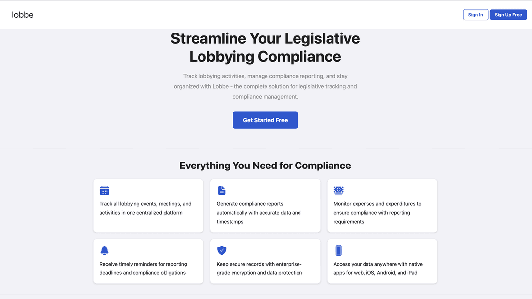 A legislative trackking and compliance platform, helping lobbyists and related functions avoid fines, and save time with iOS, Android and Web apps.