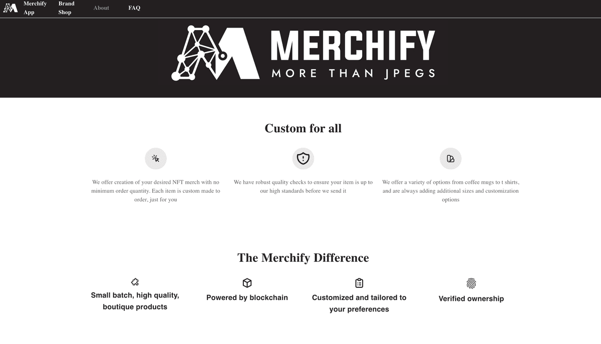A NFT platform that connects NFTs with the real-world, allowing NFT art to be embedded and linked on physical merchandise. Merchify worked with Cardano, Polygon, and other blockchains, and accepted crypto as payment for on-demand custom merchandise.